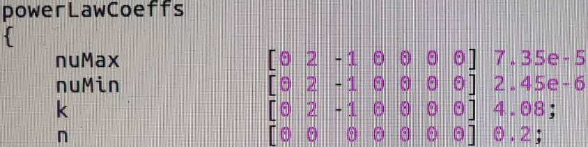 两个非牛顿液滴对心碰撞,初始碰撞速度是1.79m/s,采用幂律模型,计算结果导出的粘度数值特别小,请问这是正常的莫,请大家指点下,我的问题可能出现在哪里? 相关设置如下: 幂律模型: 初始粘度设置如下: 计算结果导出的部分速度梯度和粘度数据如下: