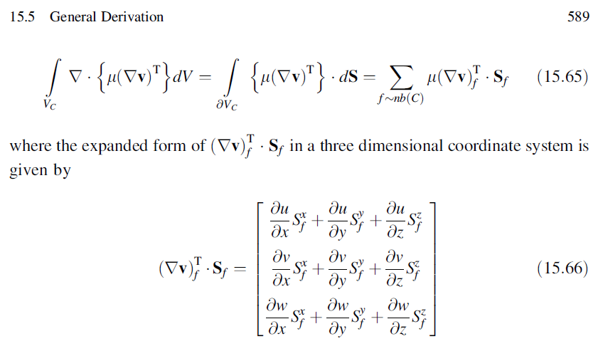 \int_\limits{V_C}\nabla\cdot\{\mu(\nabla\mathbf{v})^\top\}dV=\sum_\limits{f\sim nb(C)}\mathbf{S}_f\cdot\{\mu(\nabla\mathbf{v})_f^\top\}